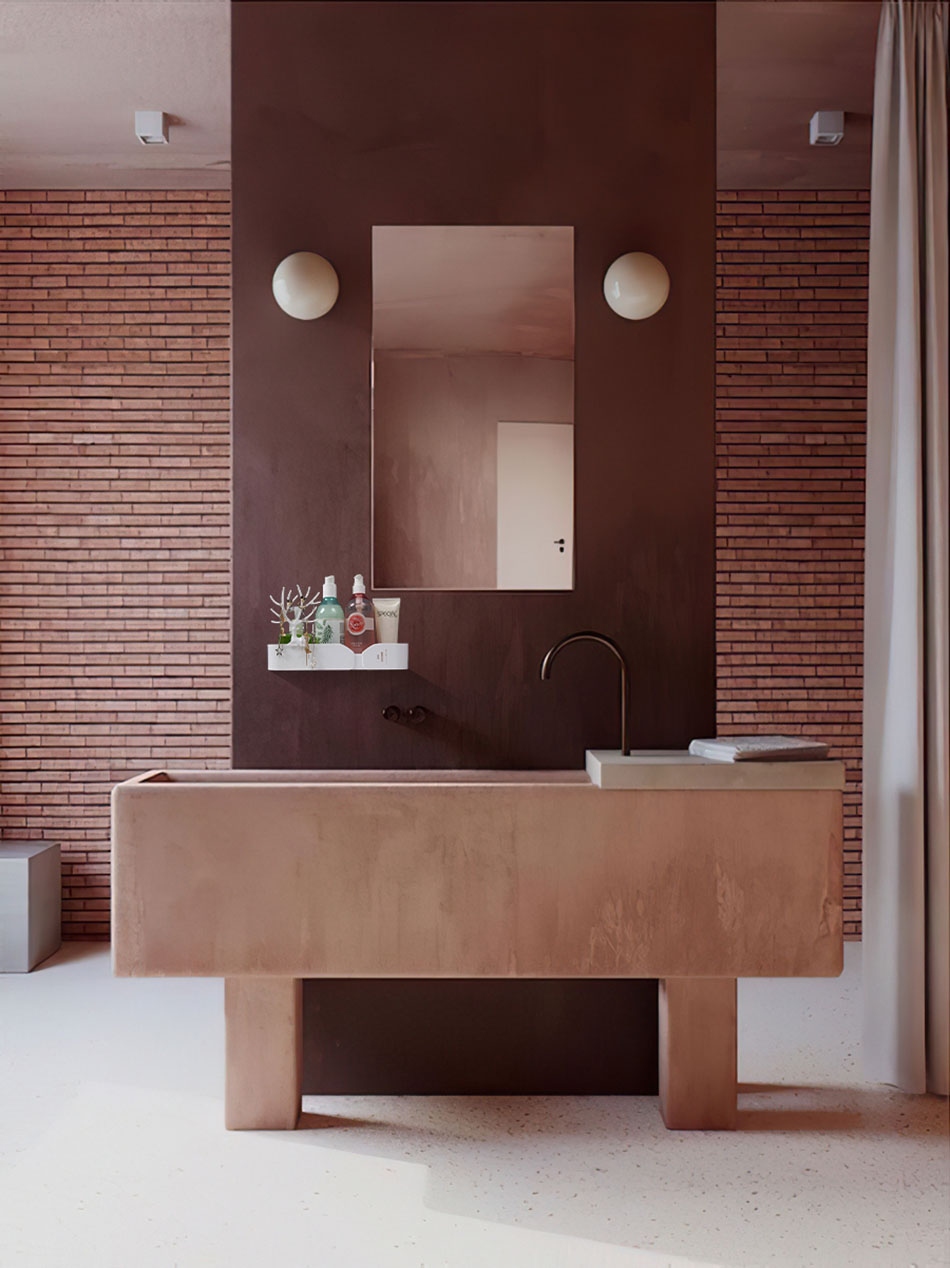 If you want a lavish bathroom that also feels calm and moody, try incorporate earthy  colors into your space. Earth tones like warm browns, soft beiges, muted greens, and even some deep red touches makes a smooth atmosphere that is both relaxing and sophisticated.