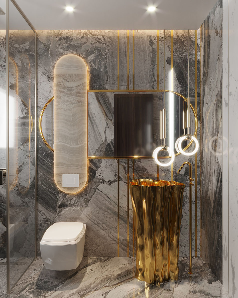 To help create this spaces think about using natural materials, for example, amarble vanity top combined with deep wood details creates a stunning contrast that is both modern and timeless. Stone and wood are great details that help to add texture and depth into the space.