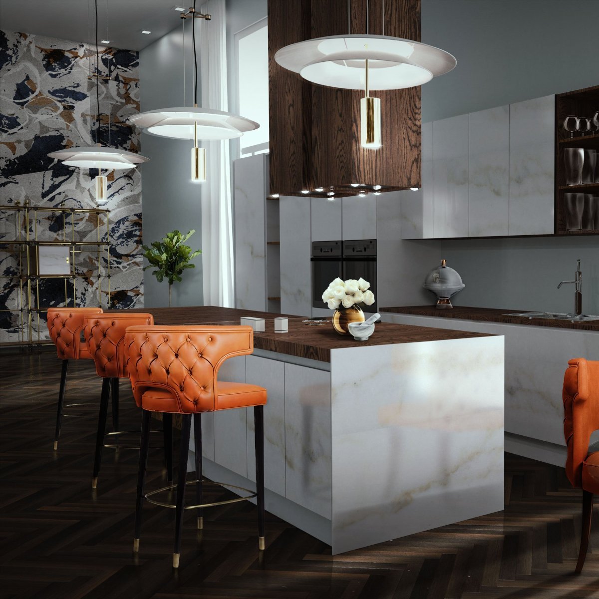 Fall calls for vintage. The combination of the vintage colors, orange, brown and grey make your kitchen the best one. The Basie Suspension Lamp will complete the interior design style, with a gold-plated body and a matte white shade this white chandelier creates a perfect vintage style (as you can see by the image above).