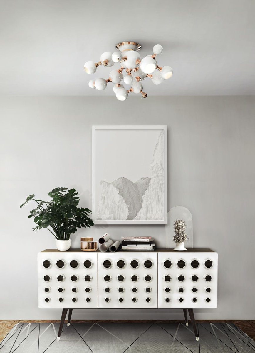 Monocles sideboard has got to be one of the most iconic and beloved Essential Home pieces, and it shows up here on a living room corner in tones of metallic grey. Paired with a geometric rug such as Hitchcock, another rug from the Essential Home collection, it’s the perfect look for a minimalist living room in tones of white. With accessories, art pieces and a suspension lamp such as the Atomic Ceiling Lamp by DelightFULL, you can’t go wrong in bringing this style into your living room decor.