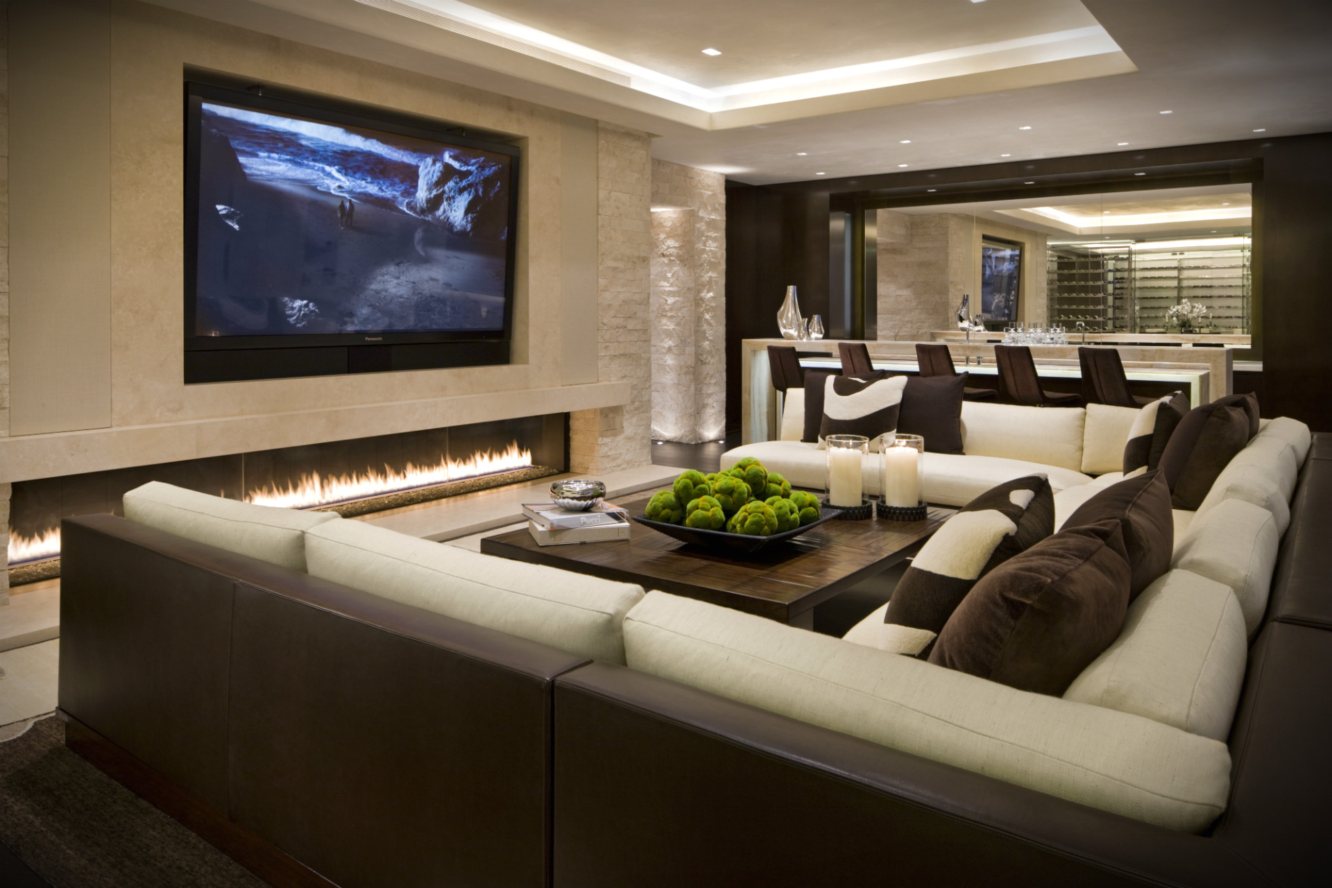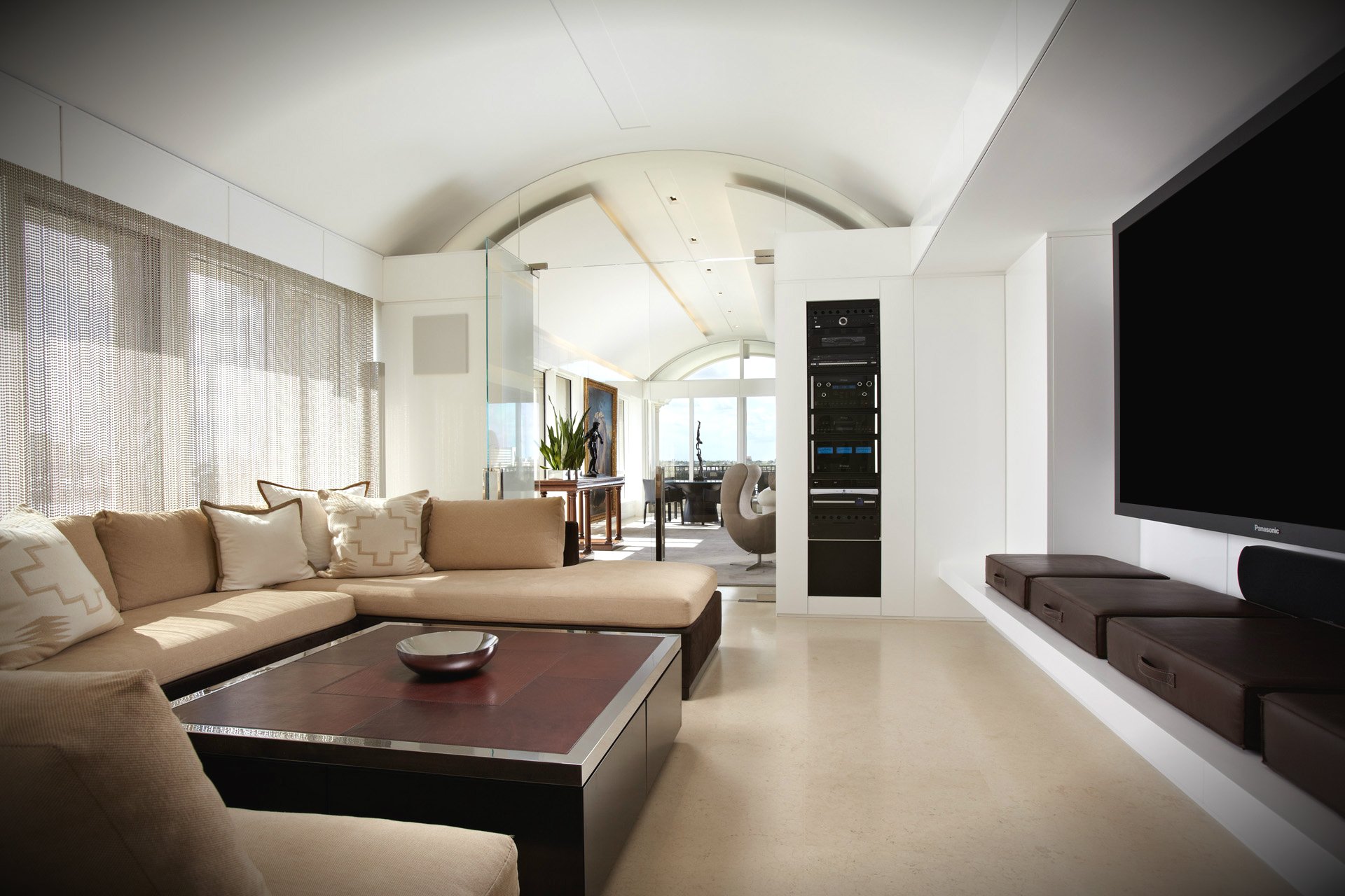 For a more urban style, Pembrooke & Ives opted to use darker colors, but not too dark and a piece like this blue sofa which stands out from the rest. For a nice time watching a movie in a Palm Beach Penthouse, a big sofa with nude tones and simplistic decoration.