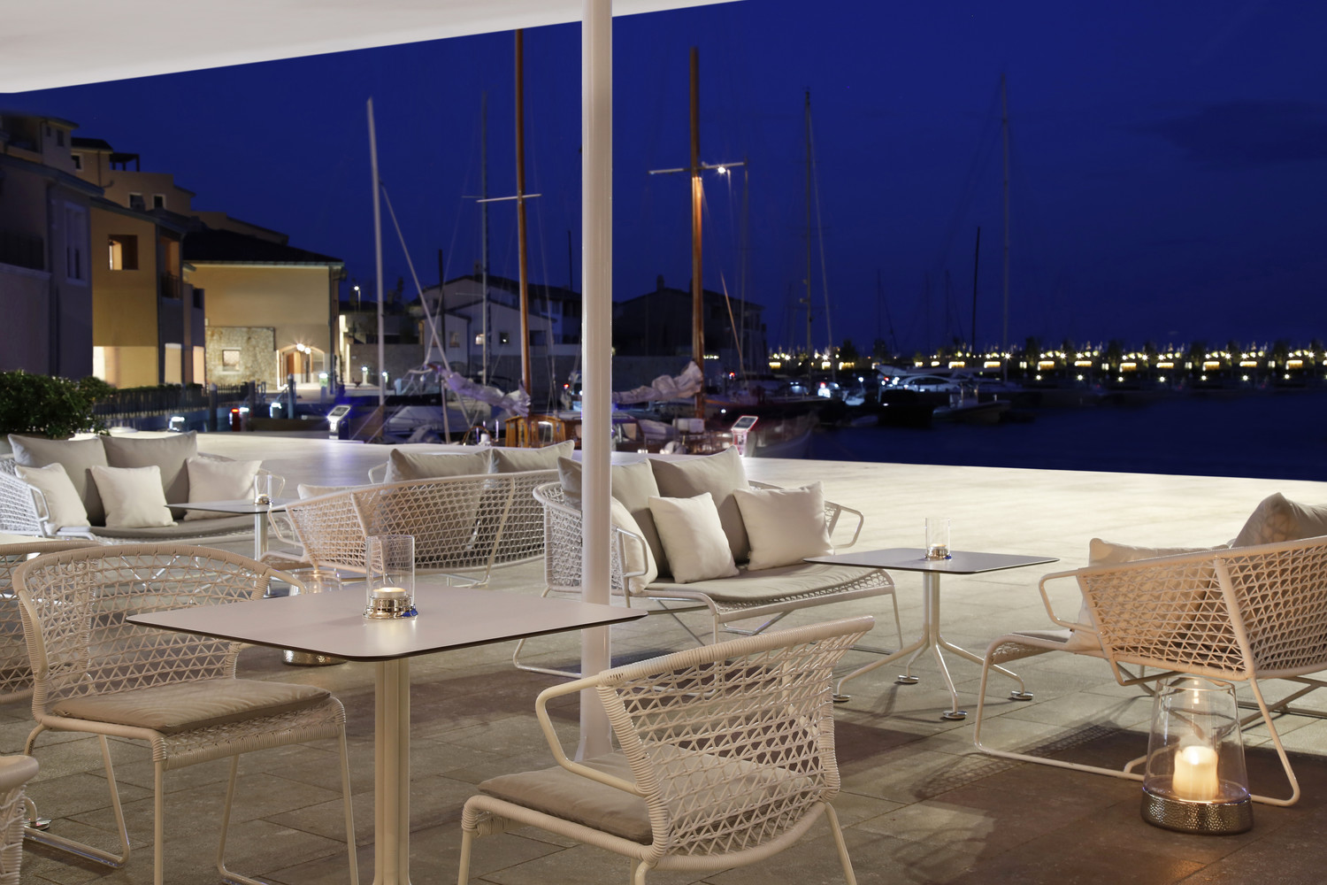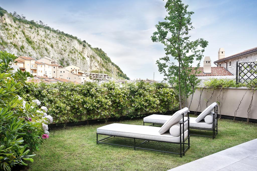 The spacious rooms – all of which overlook the Adriatic, the piazza or the marina – are by Rome-based Lazzarini Pickering Architects and they bear more than a passing nod to Gio Ponti’s designs for ocean liners with their brass and bronze trims, fabric panels of Robin’s-egg blues, mustard yellows, and burgundy, the soft angular lines of alcove armchairs, and stylised canopy beds, the latter inspired, we hear, by the Hapsburgs. This close to the border of Slovenia and Croatia, the scenery, climate, and cuisine is rightly deserving of hyperbole, the triptych best experienced while lounging on the Falisia’s private beach with nothing on the agenda other than what to have for dinner.