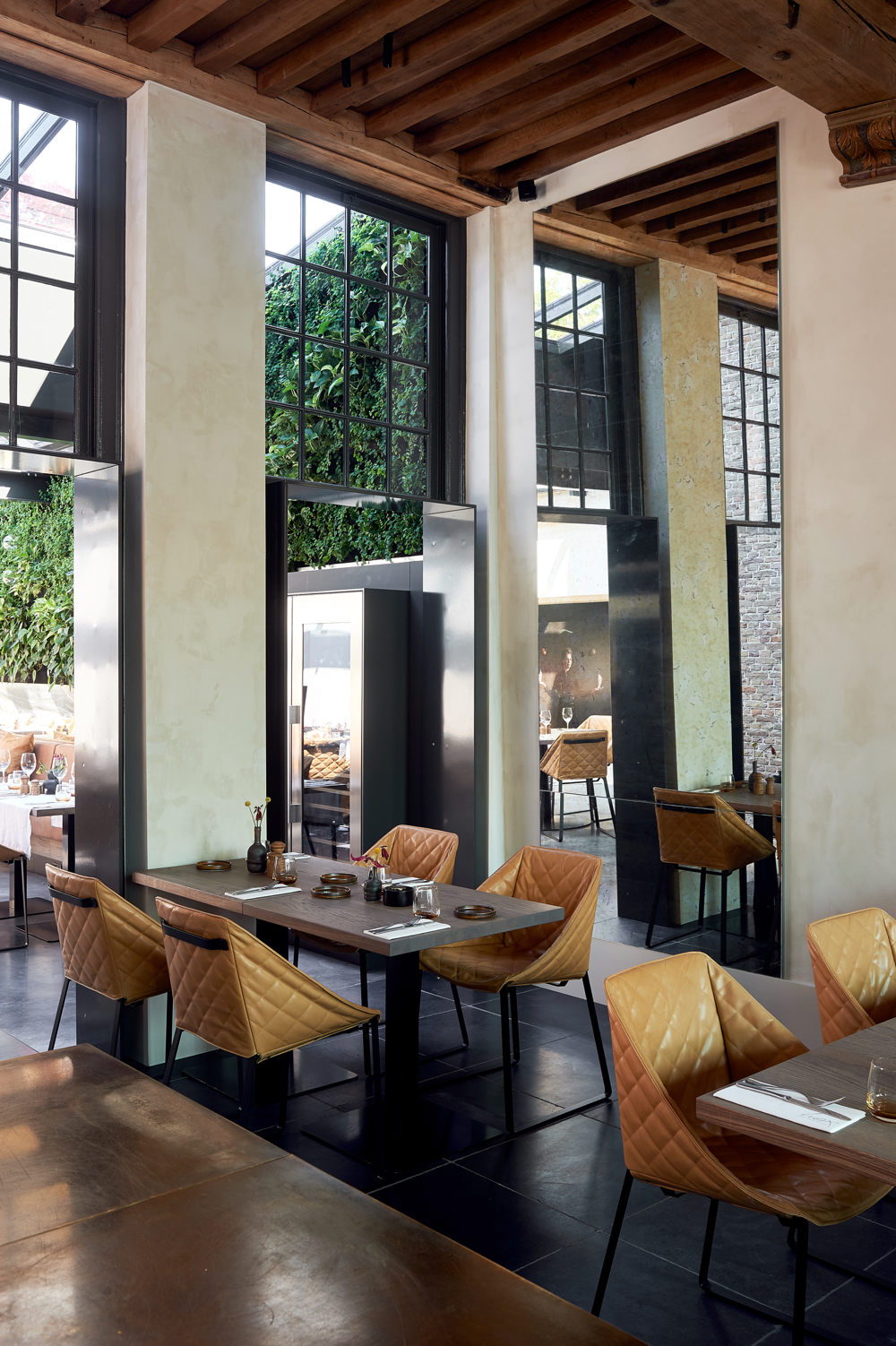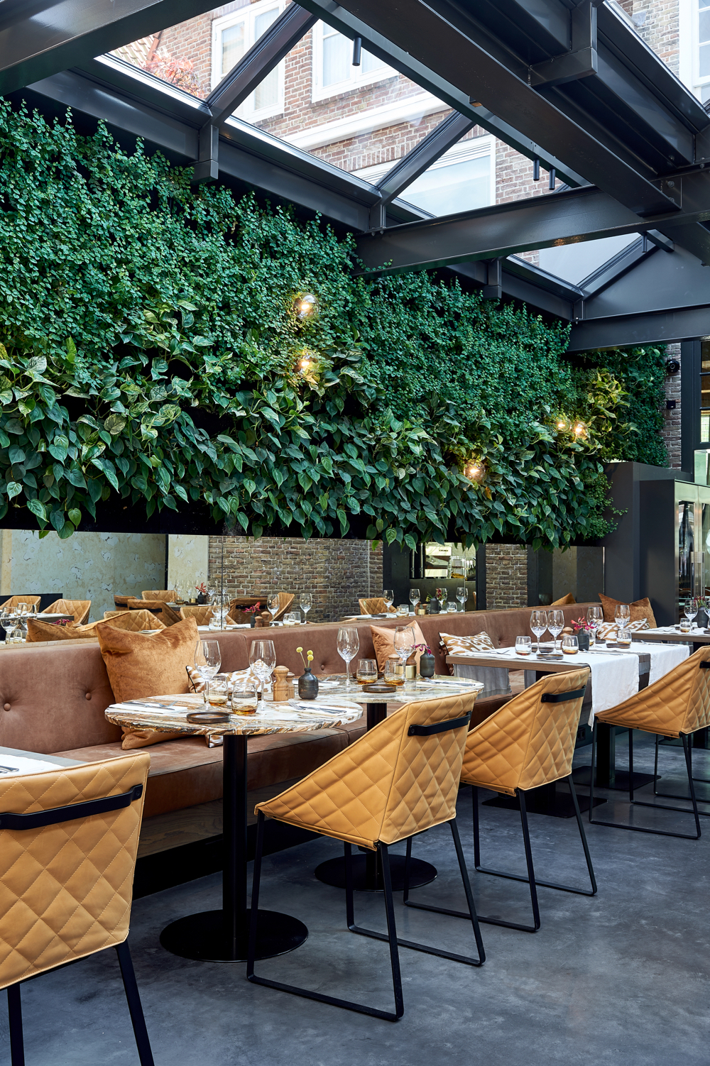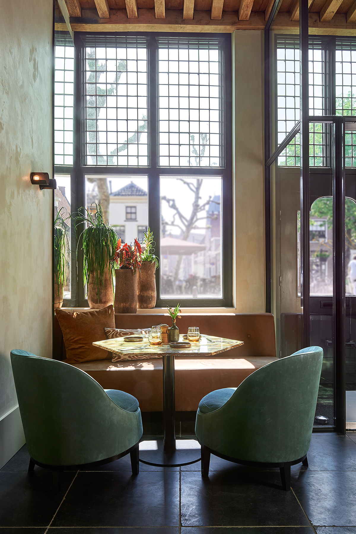Wils works her own brand of magic in the classic four-story, the dark-bricked townhouse whose bright and lofty interiors have been reimagined by Studio Piet Boon. In particular, dark stone floors provide a handsome canvas on which is layered a garden wall that frames the conservatory, deeply set banquettes, and marble tabletops, all wrapped in a light yellow color scheme inspired by the hemp ropes traditionally produced in the town.