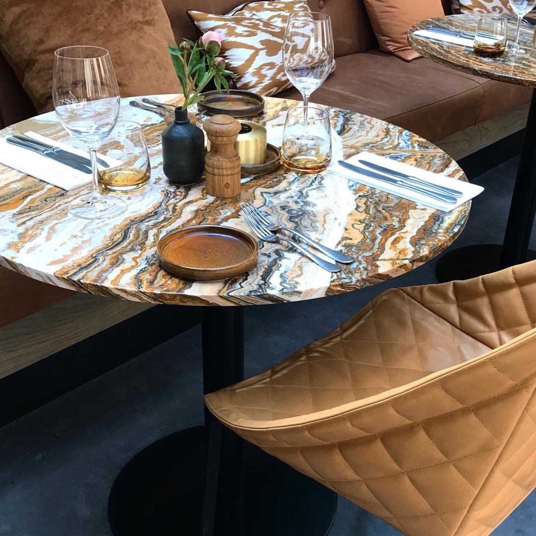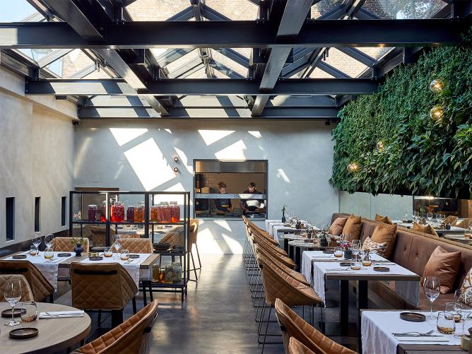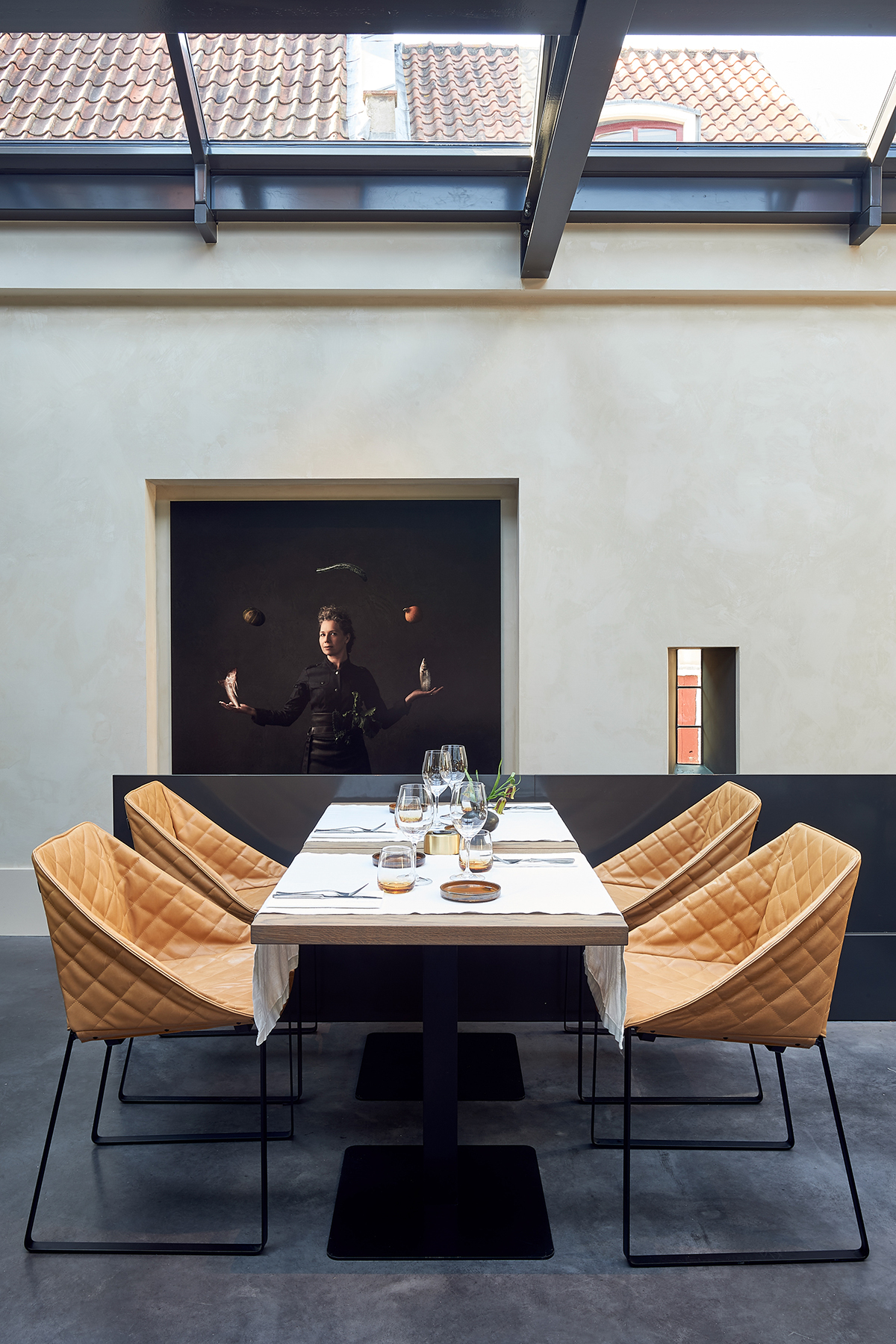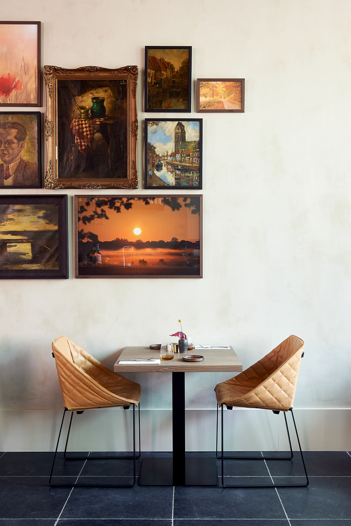 Wils works her own brand of magic in the classic four-story, the dark-bricked townhouse whose bright and lofty interiors have been reimagined by Studio Piet Boon. In particular, dark stone floors provide a handsome canvas on which is layered a garden wall that frames the conservatory, deeply set banquettes, and marble tabletops, all wrapped in a light yellow color scheme inspired by the hemp ropes traditionally produced in the town.