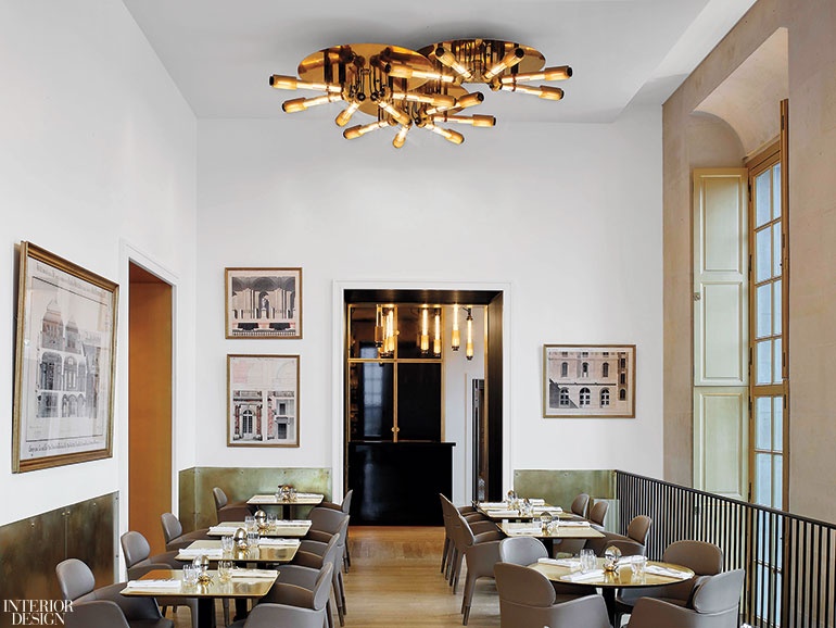 The restaurant’s name, it refers to oris, specifically to the long-ago royal cooks and kitchens that fed Versailles. But the wordplay with gold ore works equally well in the gilded realm of Versailles, where even the rooftop is plated with gold leaf. As such, materials like brass and aluminum, often with golden finishes, appear throughout the establishment. That’s the work of Gaëlle Lauriot-Prévost, DPA’s art director and Ore’s interior design lead. Metal is her specialty, including metal mesh and metallic cloth, both used here. Each finish, she says, “catches the light, and conducts it in a different way, giving a vibrant texture.”